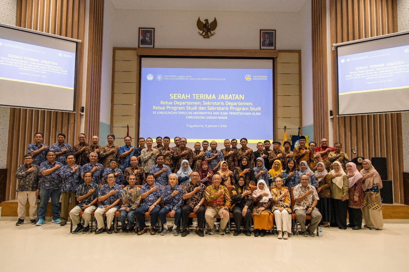 Fakultas Matematika dan Ilmu Pengetahuan Alam (FMIPA) Universitas Gadjah Mada (UGM) menyelenggarakan sesi serah terima jabatan struktural di tingkat departemen dan program studi pada Kamis, 8 Januari 2026, bertempat di Auditorium Herman Yohannes FMIPA UGM. Kegiatan ini menjadi penanda dimulainya masa bakti kepengurusan baru di lingkungan FMIPA UGM. Acara diawali dengan pembukaan, dilanjutkan dengan prosesi simbolis serah terima jabatan yang ditandai dengan penandatanganan dokumen, serta sesi sambutan dari Dekan FMIPA UGM, Prof. Kuwat Triyana, S.Si, M.Si..
