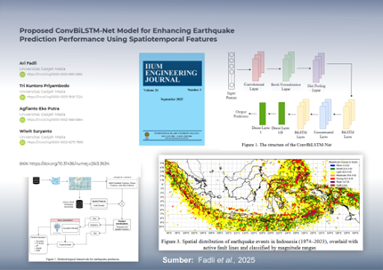 Melalui penelitian ini, telah dikembangkan sebuah model kecerdasan buatan (Artificial Intelligence/AI) bernama ConvBiLSTM-Net, yang dirancang untuk menganalisis parameter utama gempa bumi, meliputi magnitudo, kedalaman, serta lokasi pusat gempa (episenter). Model ini menggabungkan analisis pola ruang (spasial) dan pola waktu (temporal) dari data historis gempa bumi serta informasi kepadatan sesar aktif di Indonesia.